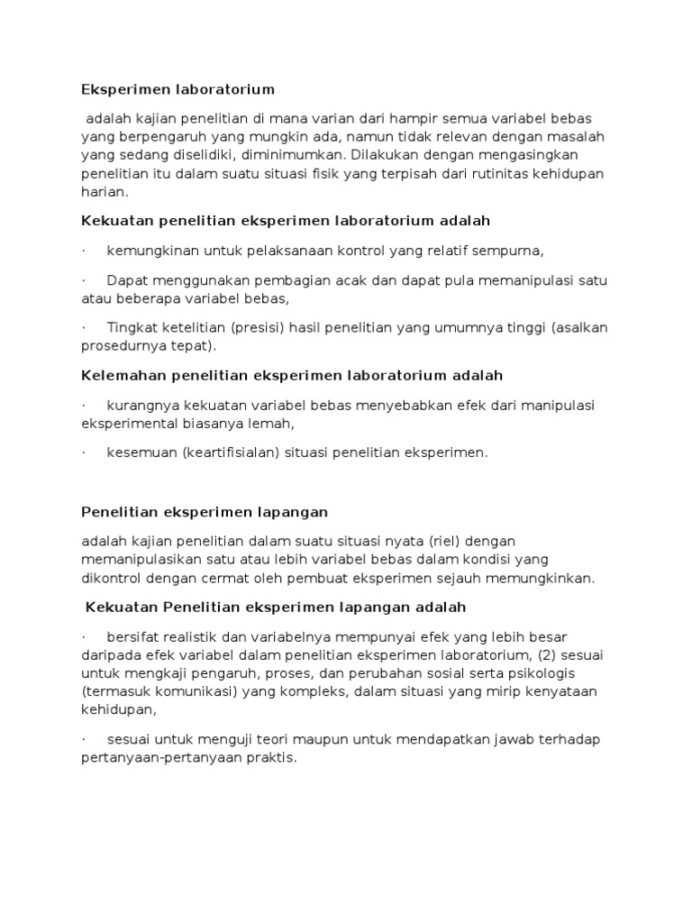 Hakekat penelitian eksperimen experimental research adalah meneliti pengaruh perlakuan terhadap perilaku yang timbul sebagai akibat perlakuan Alsa 2004. Penelitian laboratorium merupakan penelitian yang dilakukan dalam ruangan tertutup dimana kelompok eksperimen dijauhkan dari variable pengganggu sebab dapat memengaruhi hasil dari pengujian hubungan sebab akibat. RAL merupakan rancangan paling.