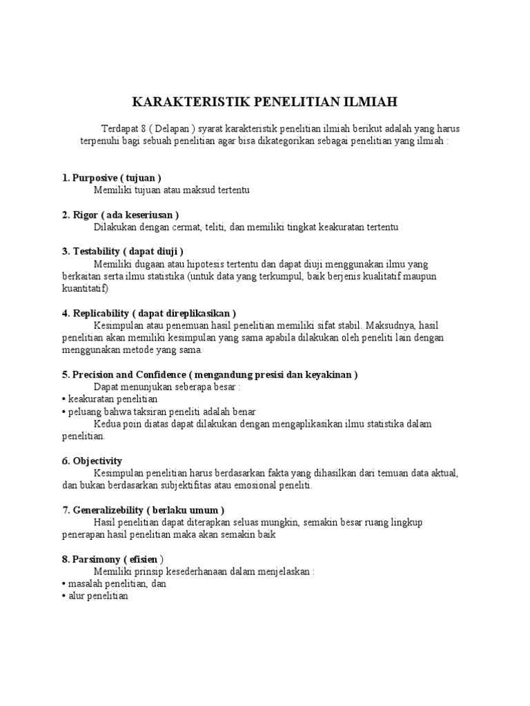 Umumnya terdapat empat karakteristik penelitian ilmiah. Kedelapan ciri tersebut adalah purposiveness rigor testability replicability precision dan confidence objectivity generalizability dan parsimony. Berarti suatu penelitian harus disusun dan dilaksanakan secara berurutan sesuai pola dan kaidah yang benar dari yang mudah dan sederhana sampai yang kompleks.