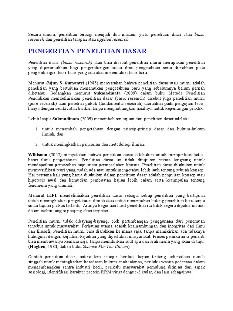 Contoh penelitian dasar yang terkait erat dengan bidang pendidikan misalnya penelitian tentang faktor-faktor yang mempengaruhi kecerdasan manusia terhadap hasil belajar. Kajian terkait dengan penelitian dasar hal yang dilakukan ialah bertujuan untuk. Peningkatan kualitas belajar mengajar siswa pengaruh pemupukan terhadap tanaman pengaruh implementasi kurikulum MBS terhadap mutu pendidikan dan sebagainya.