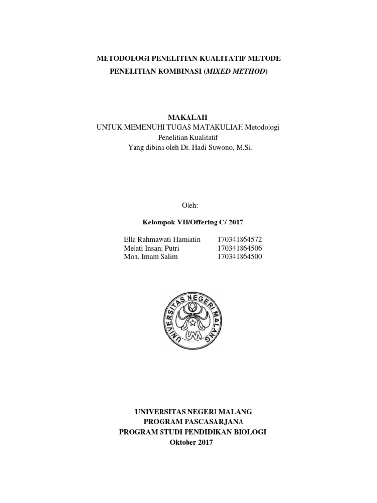 Mixed Method adalah metode yang memadukan pendekatan kualitatif dan kuantitatif dalam hal metodologi seperti dalam tahap pengumpulan data dan kajian model campuran memadukan dua pendekatan dalam semua tahapan proses penelitian Abbas 2010. PDF Makalah Desain Penelitian Mix Method Tugas Mata Kuliah Metodologi Penelitian Find read and cite all the research you need on ResearchGate. Bahwa kombinasi antara pendekatan kuantitatif dan kualitatif akan menghasilkan pemahaman yang lebih baik terhadap masalah penelitian dibandingkan bila hanya menggunakan salah satu pendekatan saja.